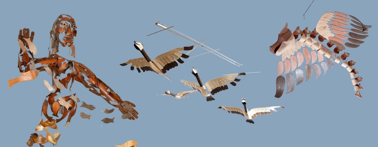 Most of my mobiles are inspired by poems, songs, or fragments of folklore. As each piece and the viewer move, shapes align and separate, shadows overlap, and meanings shift. They are delicate-looking structures which are far stronger than they look. Crafted from natural wood veneers, they are explorations of balance — between structure and freedom, between narrative and contemplation. They move in light air currents, revealing shifting shapes and shadows that aim to tell a story of their own. Although rooted in narrative, the works are equally about stillness. Their calm, floating presence encourages the viewer to pause and observe. People tell me that they can lose themselves watching them move. My mobiles have been exhibited in public settings including Dumfries Museum, and the Kirkcudbright Galleries and my work is also represented on the Crafts Council Directory, Visual Arts Scotland and Craft Scotland. Currently there are five galleries with examples of my work across the country. The same laminated veneer techniques that allow for small pieces suitable for domestic settings can be expanded into installations several metres wide. I would welcome commissions of all sizes from people with a specific idea for their home to opportunities for collaboration with architects, interior designers, and arts consultants. It’s hard to get a proper idea of the mobiles from still images. Videos of some of them can be found on my website or on my YouTube channel