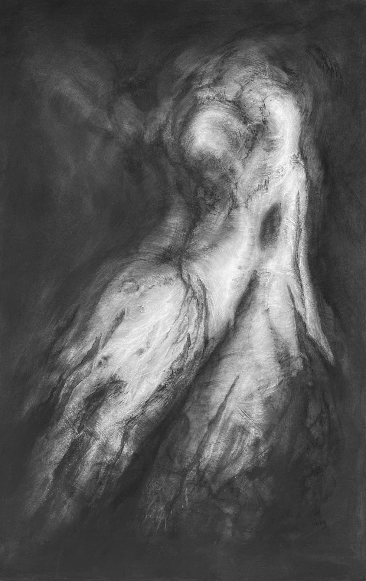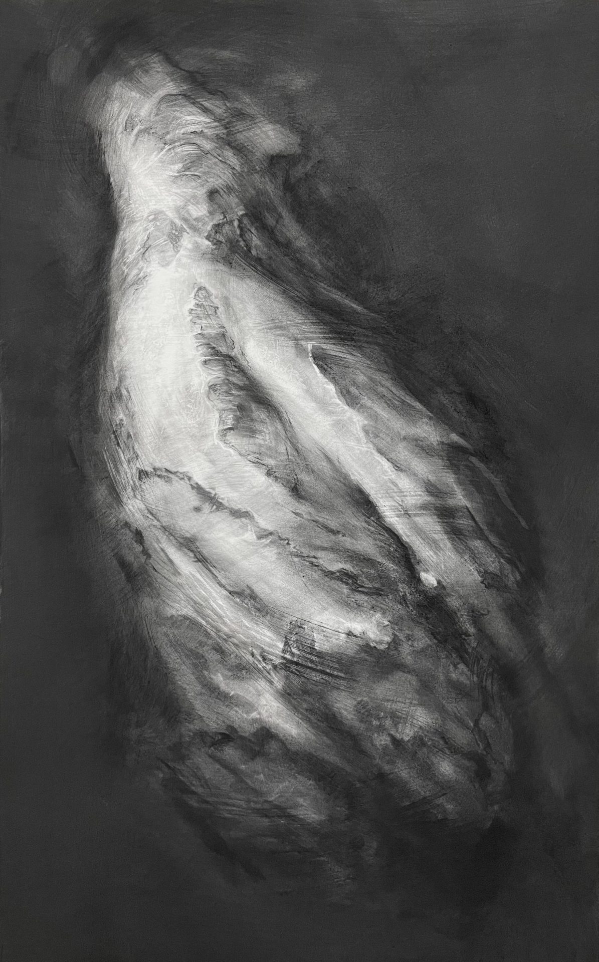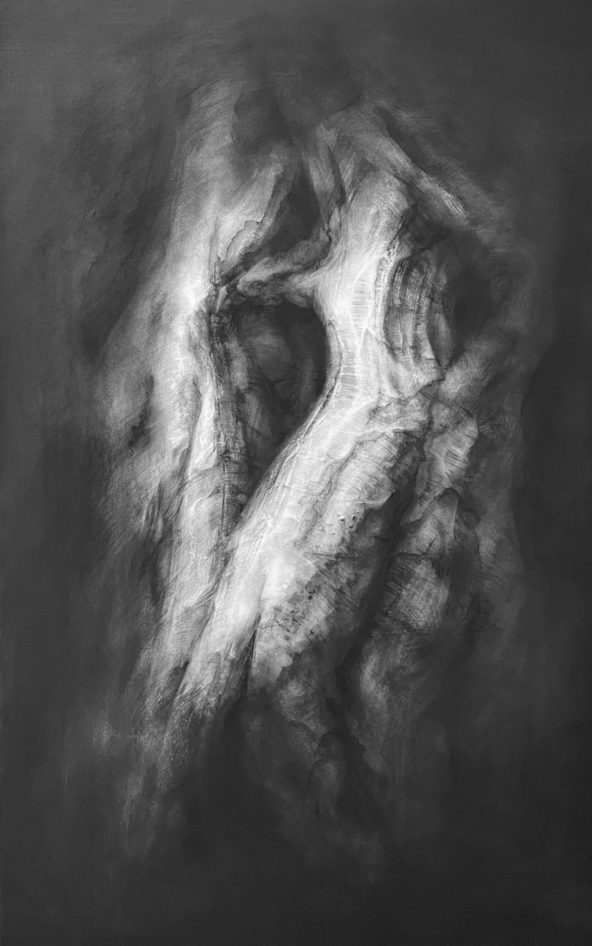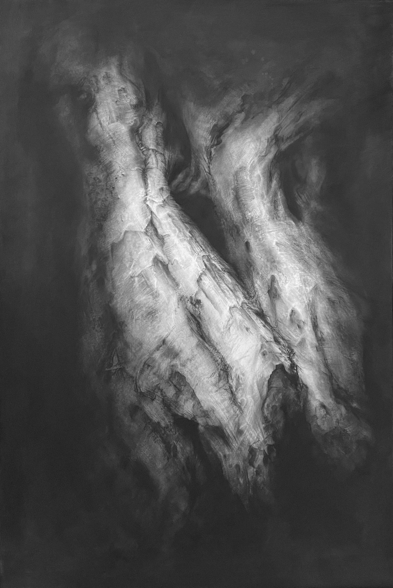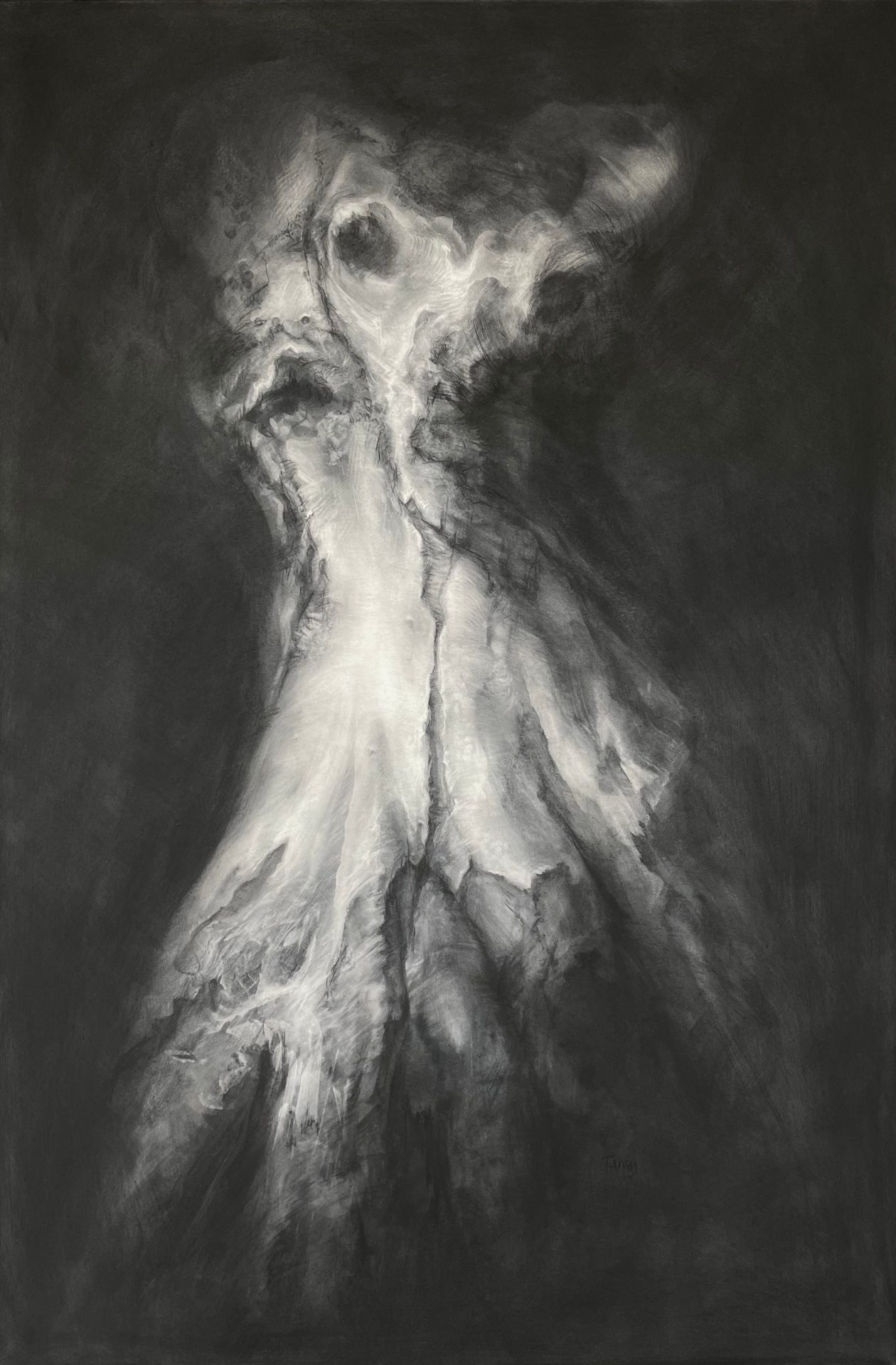 Ghosts, charcoal drawings which hover between tree and figure. Subtle, layered marks and shifts of tone suggest corporeal forms emerging from the velvety blackness of carbonised wood.
