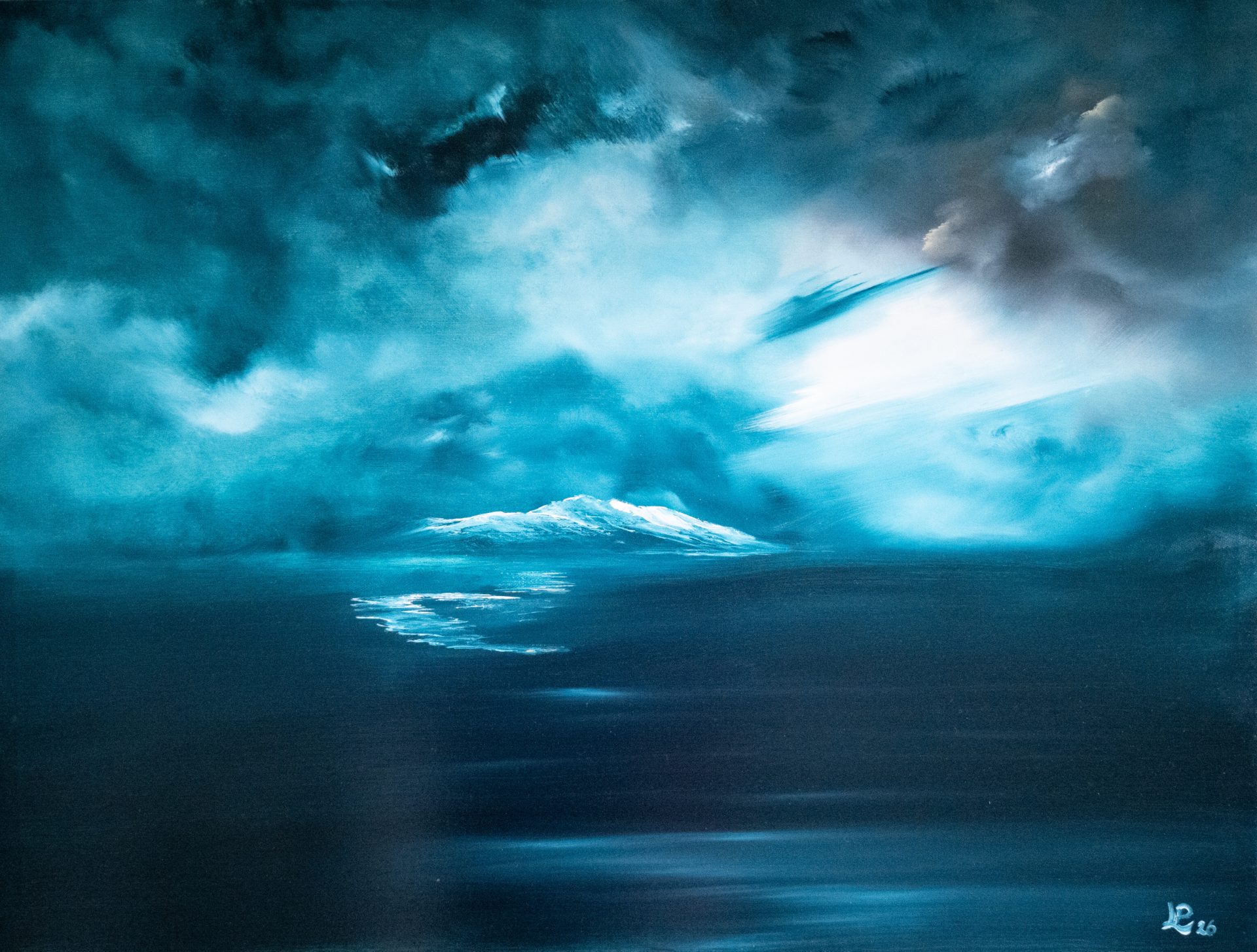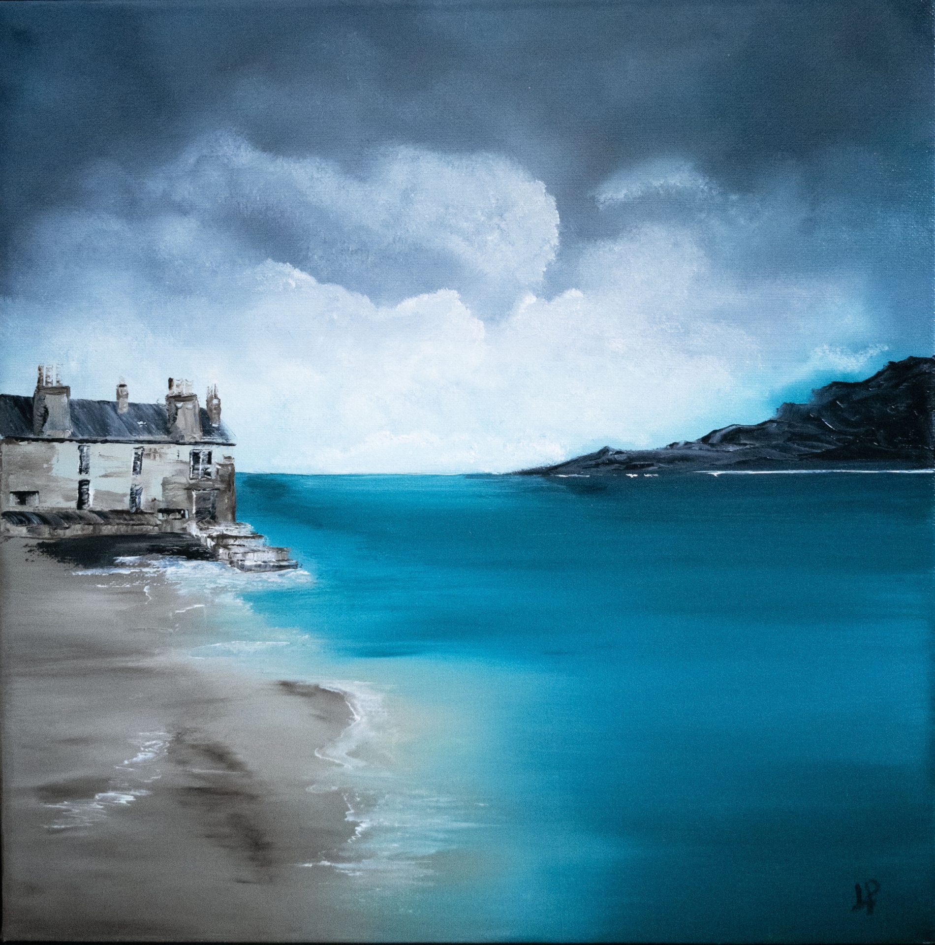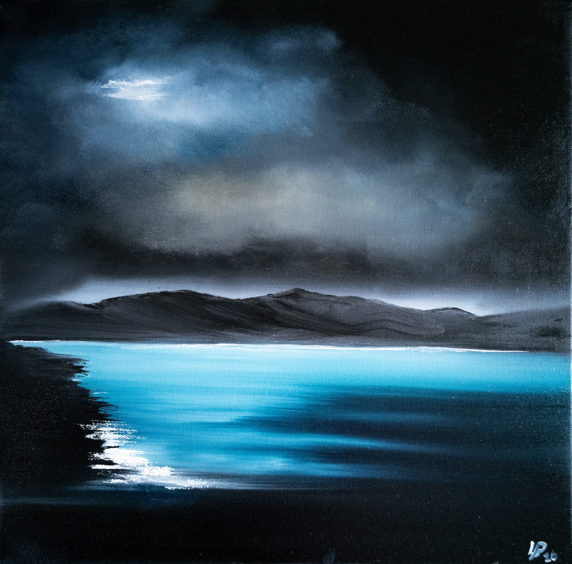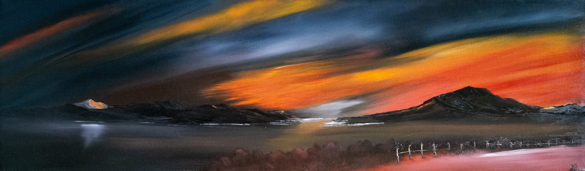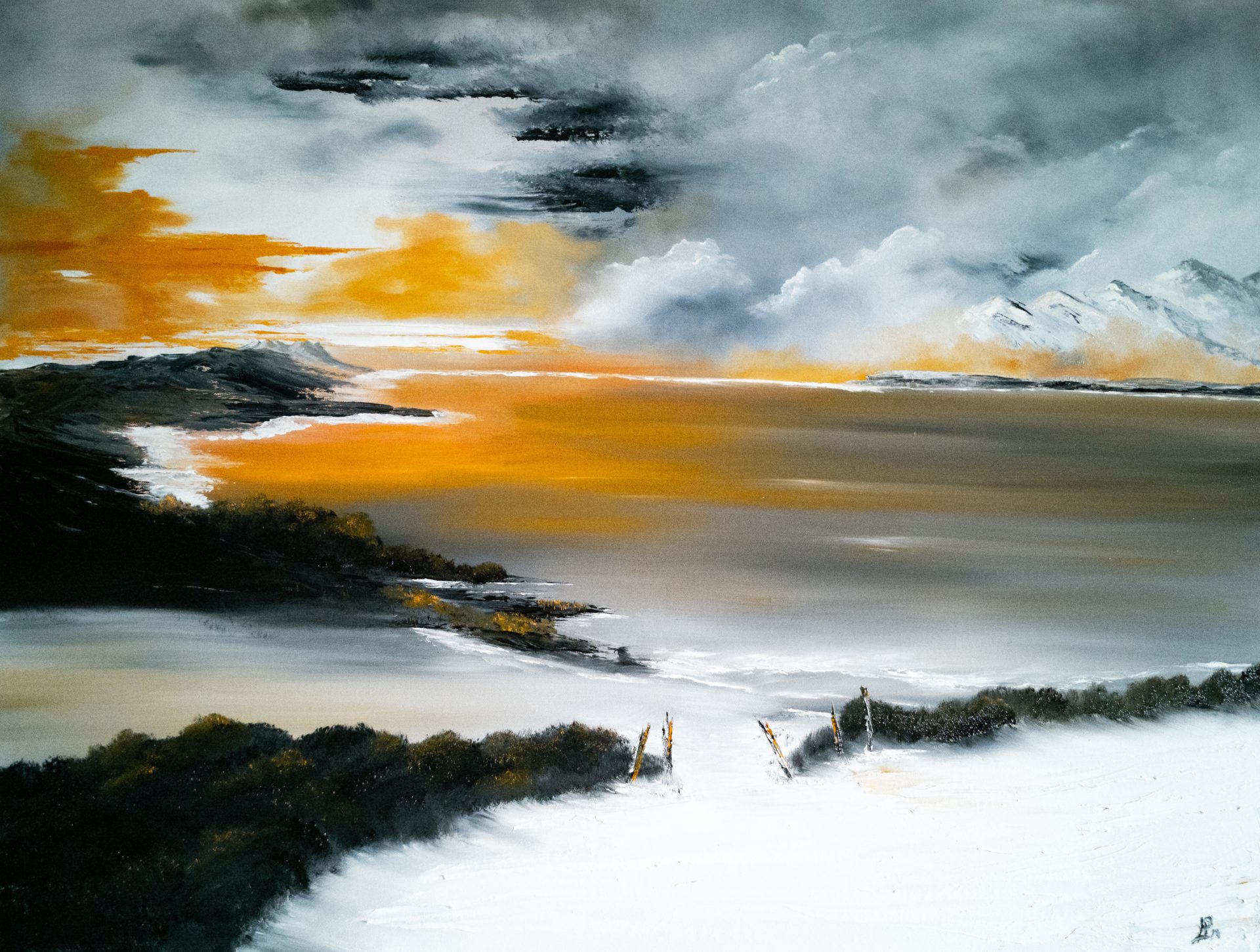 Capturing the untamed beauty of the Highlands where land sky and water merge under the weight of weather and light. Through textured knife and brushwork and a palette both muted and bold, the artist invites viewers to feel the stillness before the storm, the hush of snowfall and the quiet endurance of Highland life