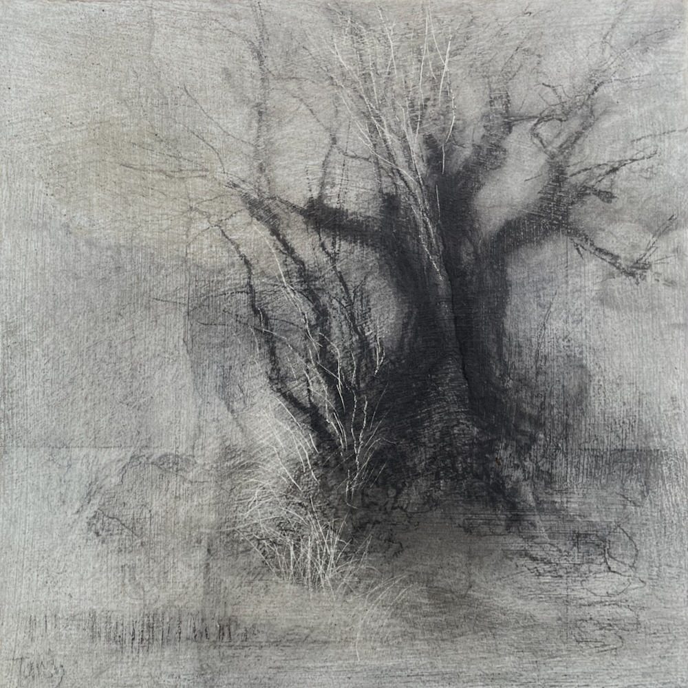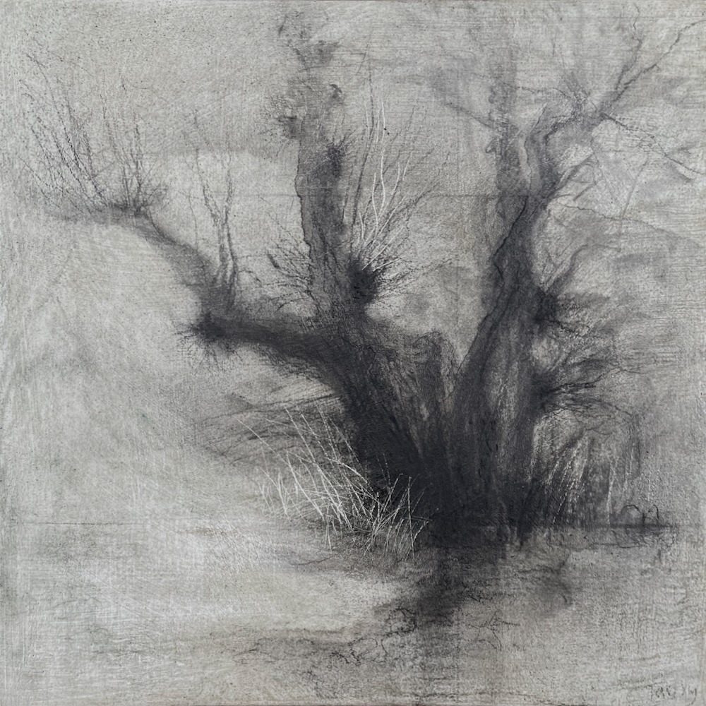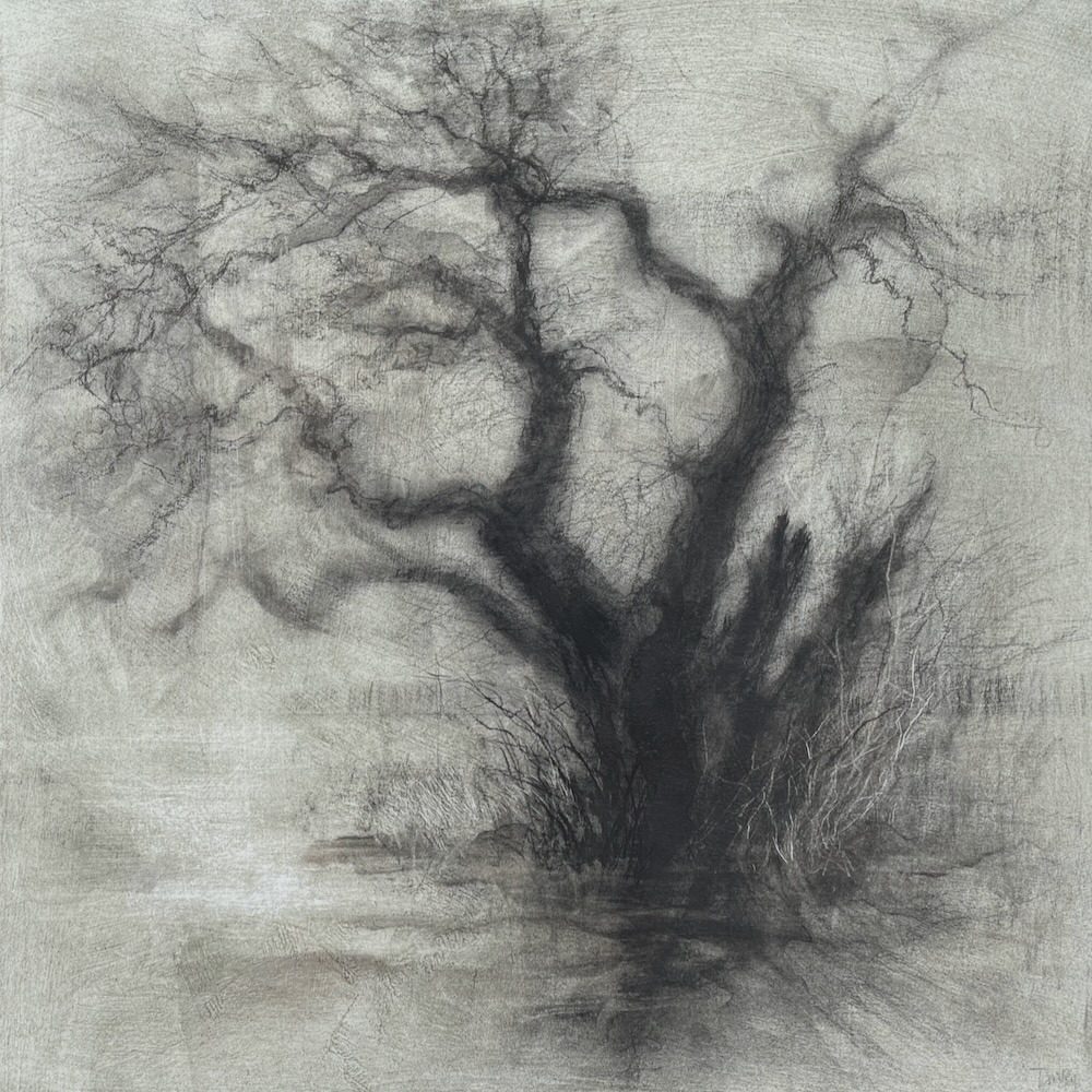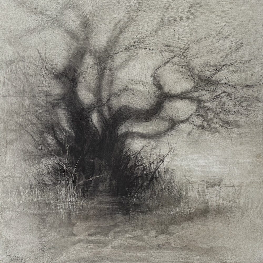 Places where wood meets water and we may meet otherness. Where alders root in the boggy earth, their unruly limbs reaching for the sky. Works in charcoal, graphite, slate, shale and mica, inspired by alder wood pasture sites around Scotland.